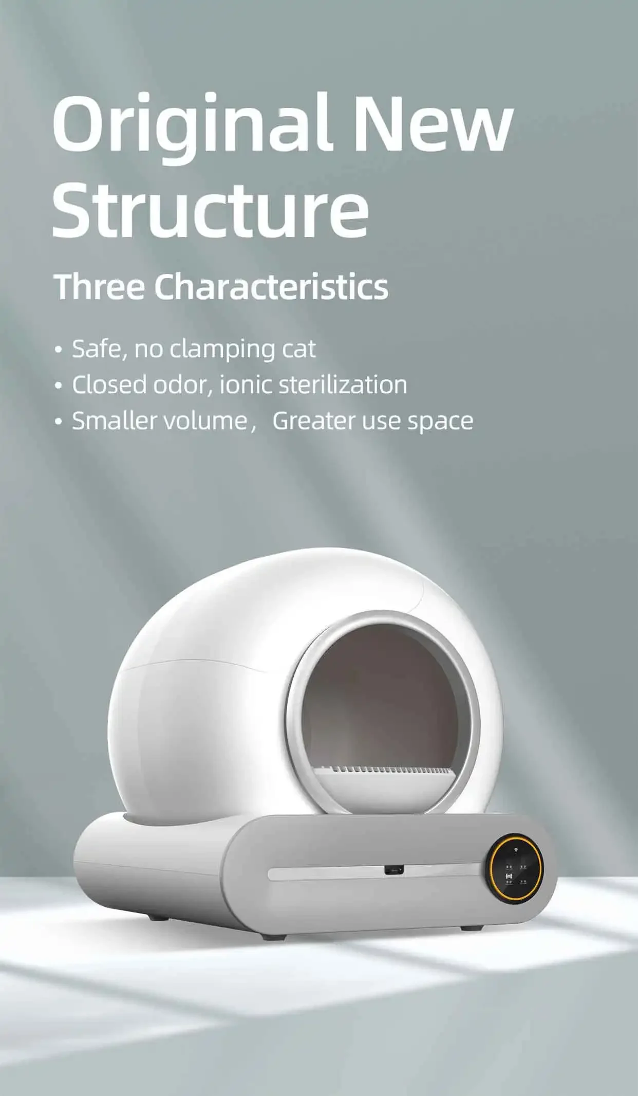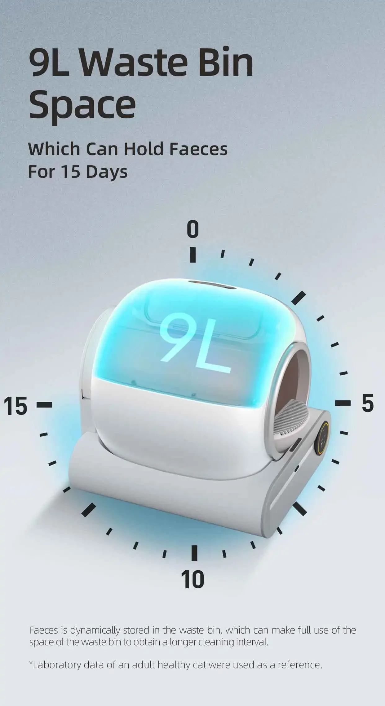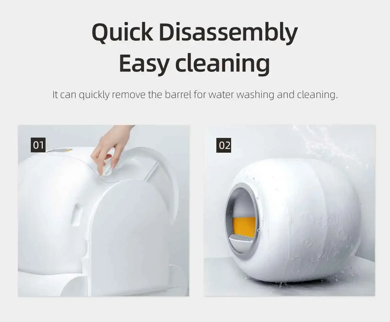 It also supports mobile phone APP remote control, which is convenient for owners to monitor and manage their cat's hygiene anytime and anywhere.Innovative Deodorization Technologyself cleaning cat litter box adopts innovative electronics Ionic deodorizer, which is safe and non-toxic, no need to replace any consumables. The Ionic deodorizer will start working after your cat has finished pooping, reducing odor emissions into the room.Low Maintenanceautomatic cat litter box is big enough for up to 3 adult cats. Worry free of replacing cat litter frequently, excellent for anyone who is busy. Cleaning automatic litter box is effortless, it only comes in two parts, pretty easy to assemble and disassemble, and you can flush the litter cylinder. Note that the base should not get wet.Smart Cleaning self cleaning litter box has automatic cleaning modes, you can watch the cat litter box clean itself versus fighting the dust. The one-click cat litter replace function can empty the old litter at one time, no more scooping! Truly free your hands.